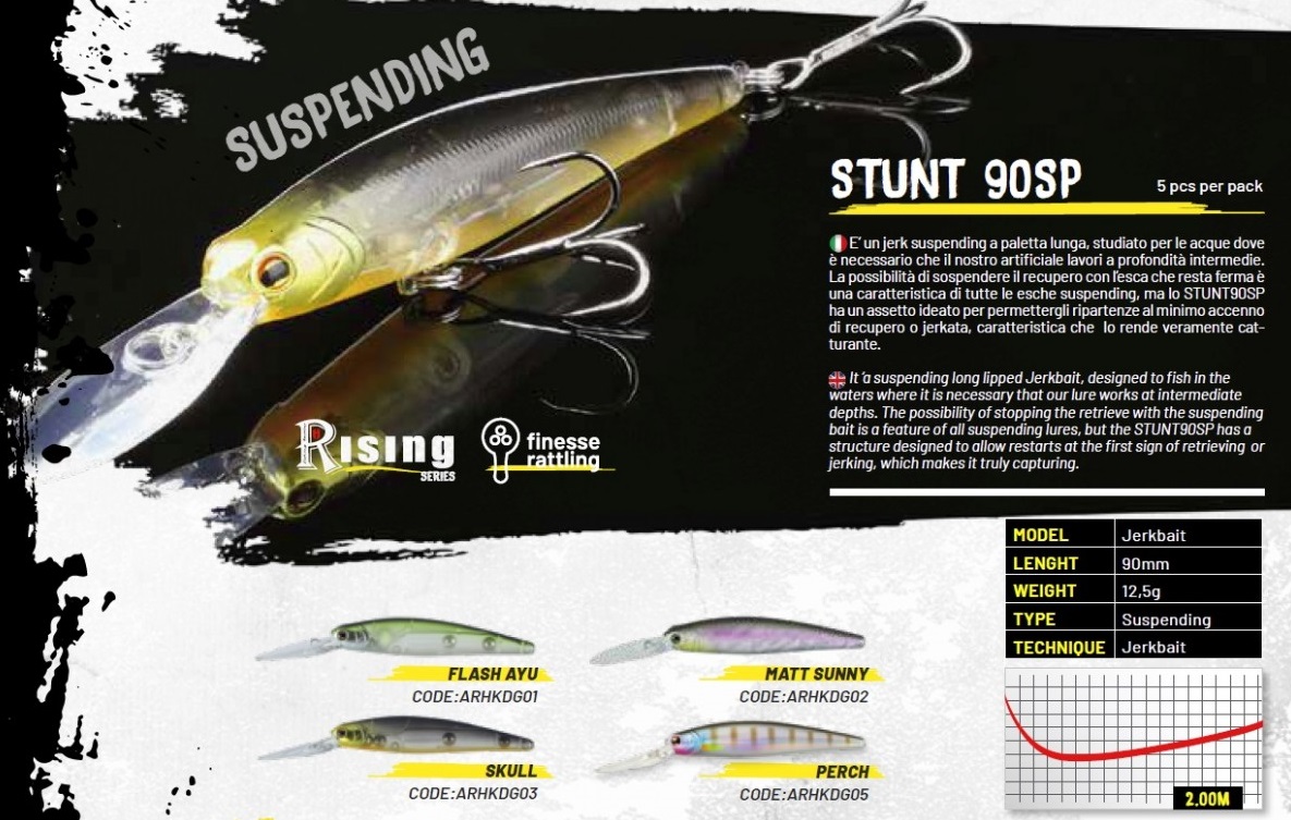 E’ un jerk suspending a paletta lunga, studiato per le acque dove è necessario che il nostro artificiale lavori a profondità intermedie. La possibilità di sospendere il recupero con l’esca che resta ferma è una caratteristica di tutte le esche suspending, ma lo STUNT90SP ha un assetto ideato per permettergli ripartenze al minimo accenno di recupero o jerkata, caratteristica che lo rende veramente catturante.
